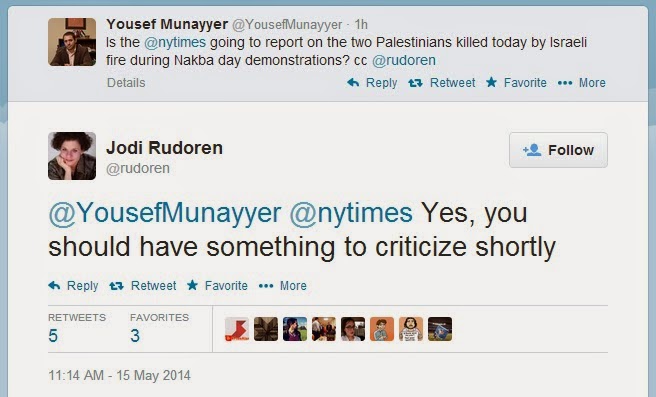 We’ve written in the past about how the New York Times’s present day Nakba narratives in news stories does not even correspond with its reporting from the time. Yesterday morning, two Palestinians were killed by Israeli fire at demonstrations in Beitunia on Nakba day. When events like this occur onNakba day, as they did in the Ethan Bronner piece discussed in the link above, some description ofNakba day and what it means are usually included in the reporting. By the afternoon, there was no reporting in the New York Times of the events so I asked on Twitter whether they will be covering it. Jodi Rudoren responded: